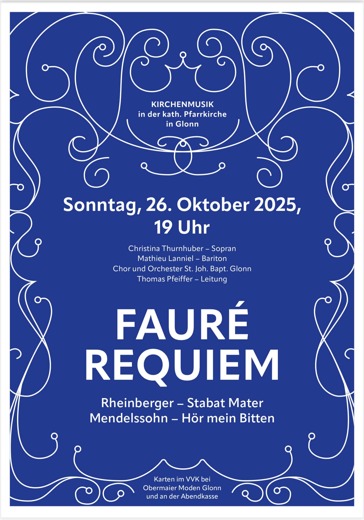 Mit den drei Werken des diesjährigen Festlichen Kirchenkonzertes in der Glonner Pfarrkirche spannt das Programm gedanklich einen Bogen von der am Kreuze trauernden „Pieta“, der Mutter Gottes, hin zum frommen Wunsch: mögen doch alle Dahin-geschiedenen, von Engeln geleitet, ins Paradies geführt werden, im bekanntesten Werk von Gabriel Fauré, seinem Requiem.