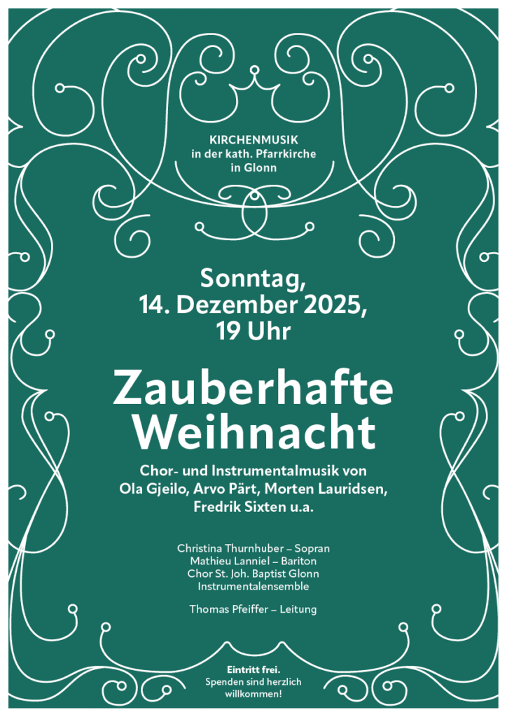 Es singen Christina Thurnhuber (Sopran), Mathieu Lanniel (Bariton), der Glonner Kirchenchor; es spielen Konrad Liebscher (Orgel) und ein Streichorchester mit Musikerinnen und Musikern aus dem Landkreis Ebersberg. Die Leitung hat Thomas Pfeiffer.